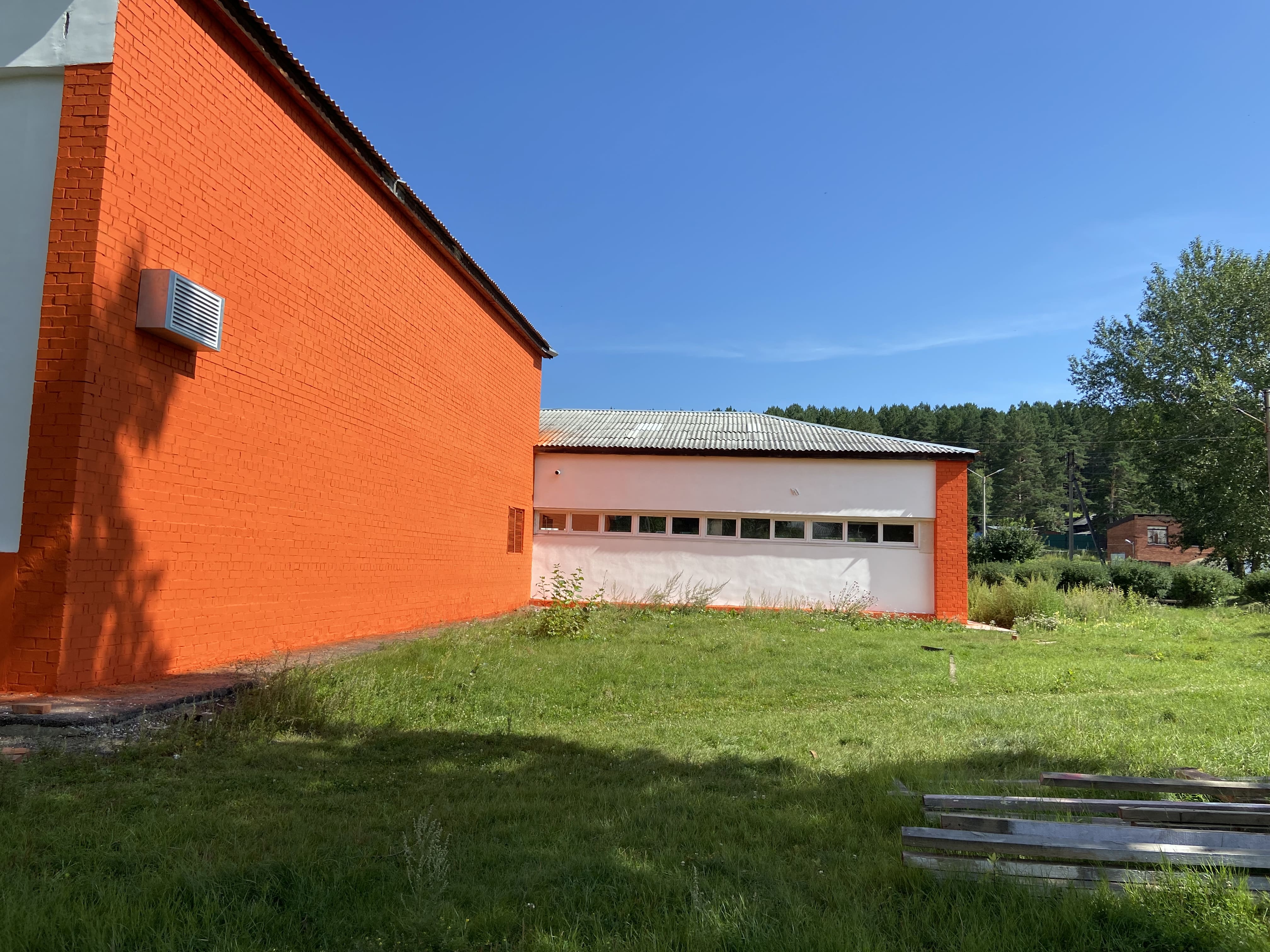 Завершена укладка профлиста над пищеблоком и младшим блоком. Закончен ремонт отмостки и штукатурка фасада.