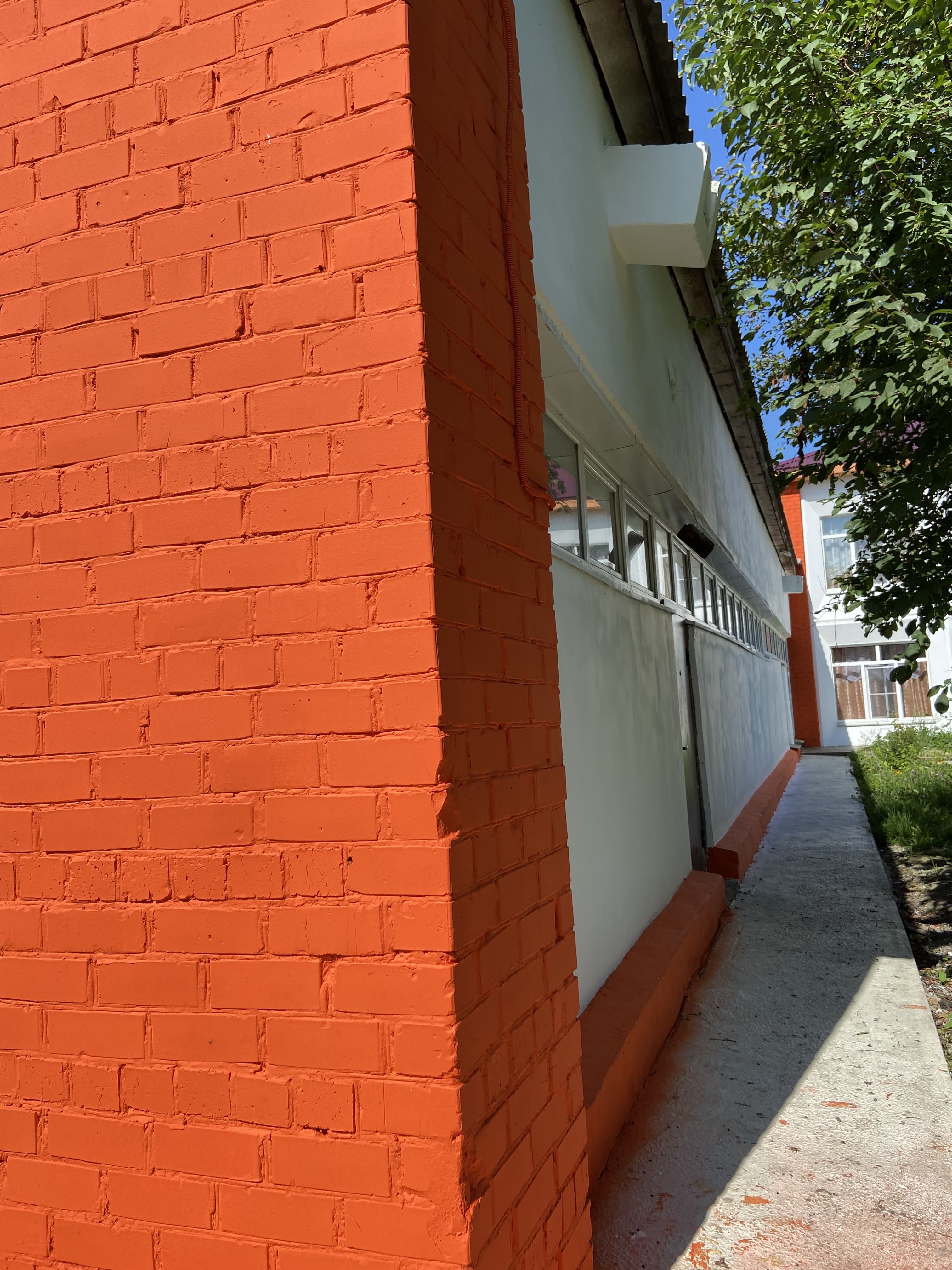 Разобрали кровлю над пищеблоком и младшим блоком, выполнены кирпичные столбики для крепления мауэрлата, начали крепить мауэрлат. Разобрали часть отмостки. Частично очистили фасад от старой краски, заштукатурена одна стена актового зала.